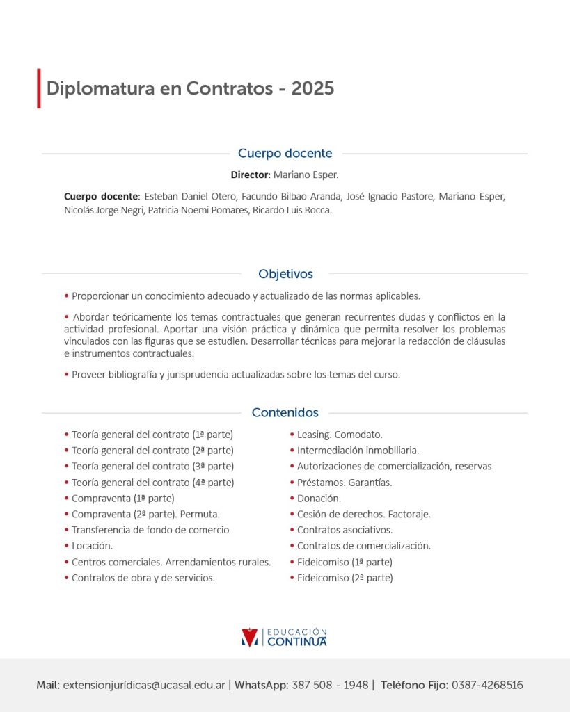 La Facultad de Ciencias Jurídicas de la UCASAL, junto al Colegio de Abogados y Procuradores de Salta, te invitan a participar por 3 becas exclusivas para cursar la Diplomatura en Contratos, en modalidad virtual y con dirección académica del Dr. Mariano Esper.