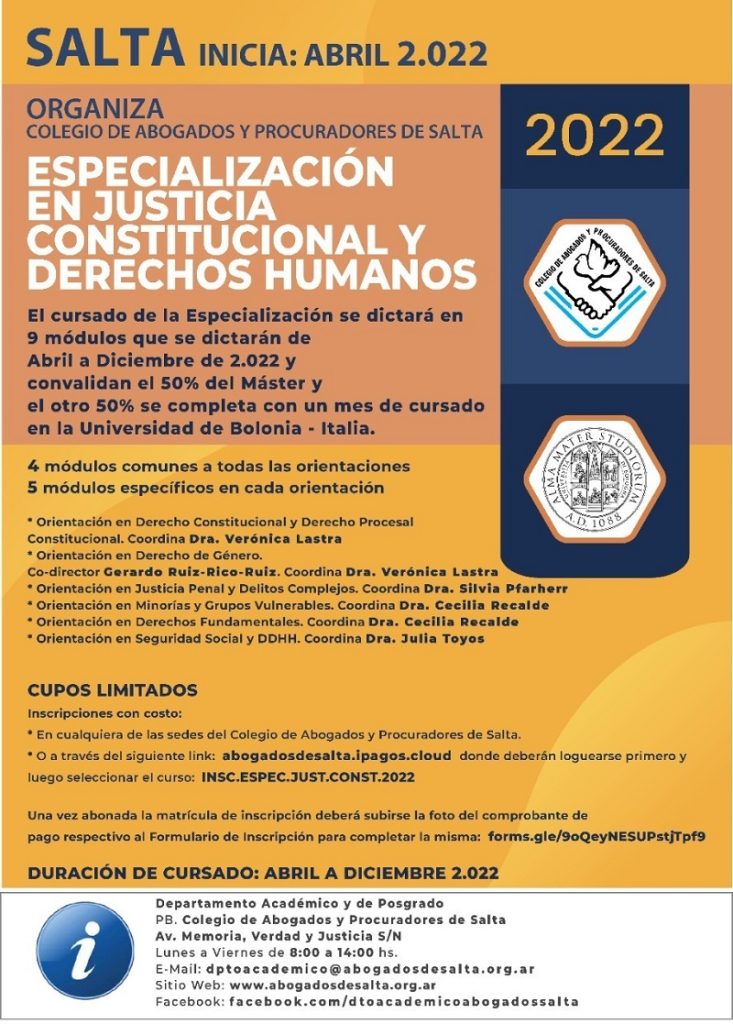 (El cursado de la Especializaci贸n se dictar谩 en 9 m贸dulos que se dictar谩n de Abril a Diciembre de 2.022 y convalidan el 50% del M谩ster y el otro 50% se completa con un mes de cursado en la Universidad de Bolonia – Italia)