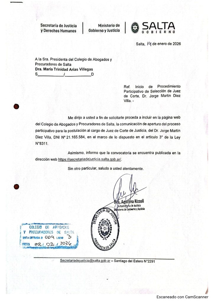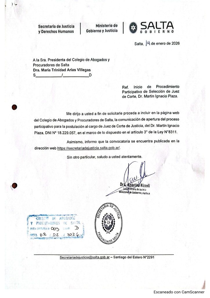 El Colegio de Abogados y Procuradores de la Provincia de Salta comunica a sus matriculados y público en general, conforme a lo requerido por el Ministerio de Gobierno y Justicia, cumplimos en comunicar que se encuentra abierto el Proceso Participativo para la postulación al cargo de Juez de Corte de Justicia de Salta del Dr. Jorge Martín Diez Villa y Dr. Martín Ignacio Plaza, ello según lo dispuesto en el art. 3 de la Ley N° 8311.