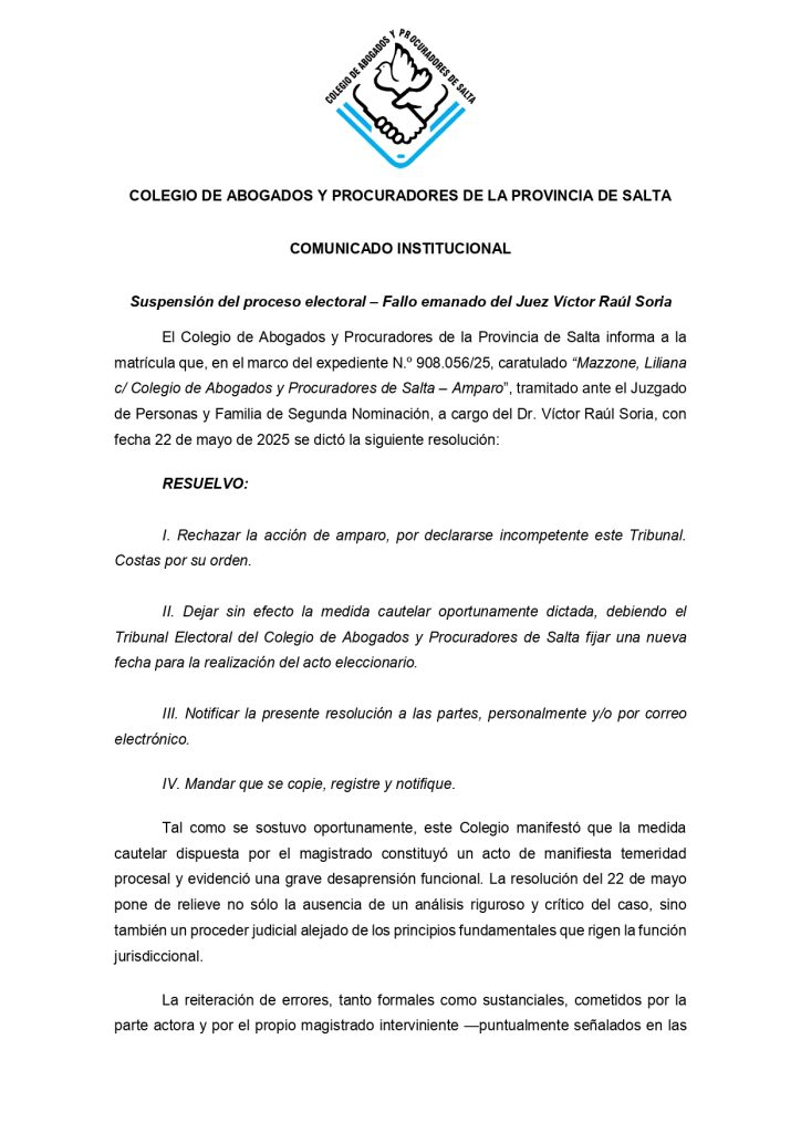 COMUNICADO INSTITUCIONAL – RESOLUCIÓN PROCESO ELECTORAL