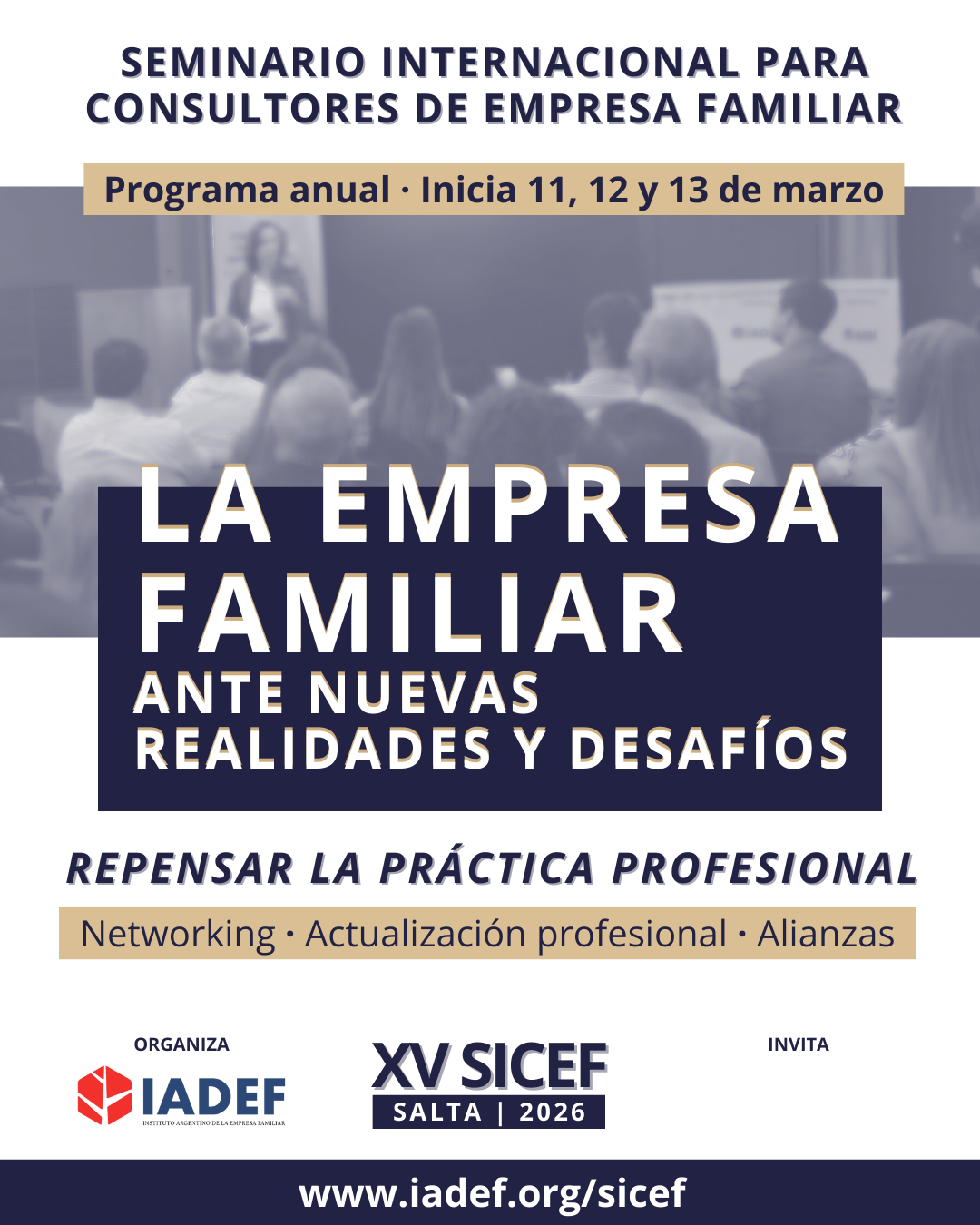 📌 En el marco del convenio de cooperación académica firmado con el Instituto Argentino de la Empresa Familiar (IADEF), invitamos a participar del XV Seminario Internacional para Consultores de Empresa Familiar, cuyo tema convocante es “Repensar la práctica profesional. La Empresa Familiar frente a nuevas realidades y desafíos”.