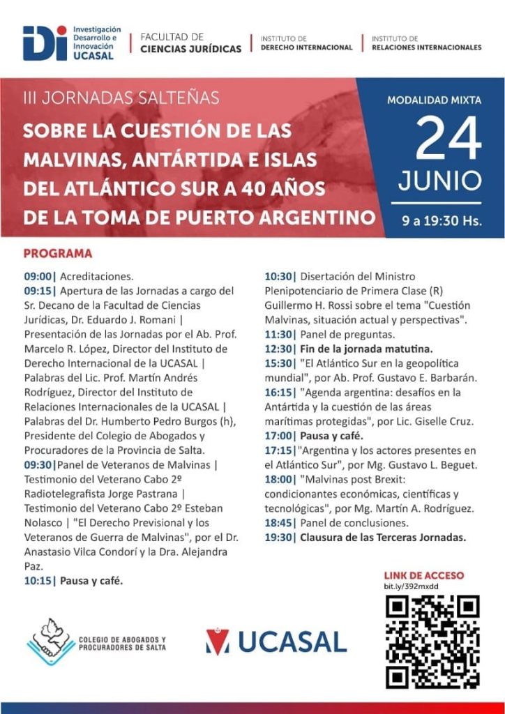 III Jornadas Salteñas sobre la Cuestión de las Malvinas Antártida e Islas del Atlántico Sur a 40 años de la toma de Puerto Argentino. Organizada en conjunto por el Instituto Jurídico Malvinas Argentinas del Colegio de Abogados y Procuradores de Salta y la Universidad Católica de Salta, a realizarse el 24 de junio de 9 a 19:30.