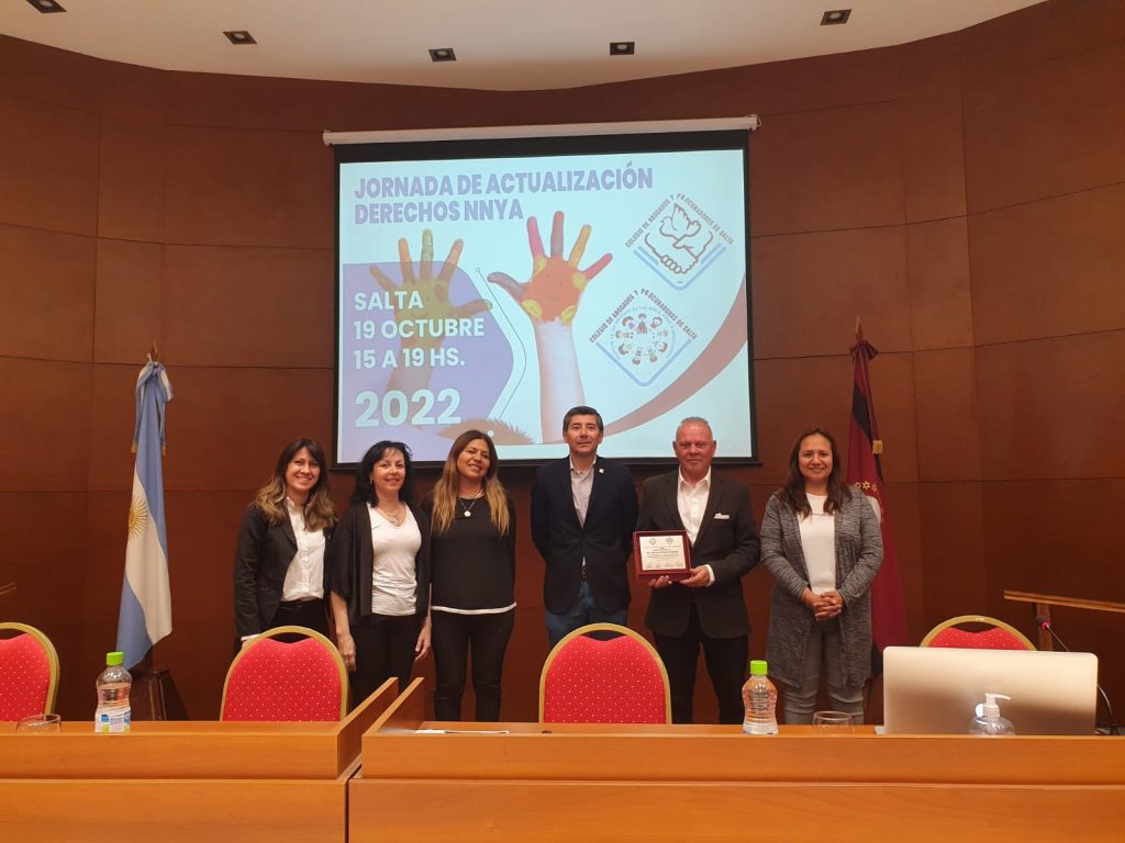En la jornada, el presidente del Colegio de Abogados y Procuradores de Salta, Dr. Humberto Pedro Burgos (h), junto a las consejeras Dra. Viviana Carrizo , quien además coordino la actividad, y Dra. Vanina Zamora reconocieron al Dr. Romano por su inmenso compromiso en la promoción y defensa de los derechos de NNyA, entregándole una plaqueta que lo declara Miembro Honorario del Instituto de Niños, Niñas y Adolescentes del Colegio de Abogados y Procuradores de Salta.