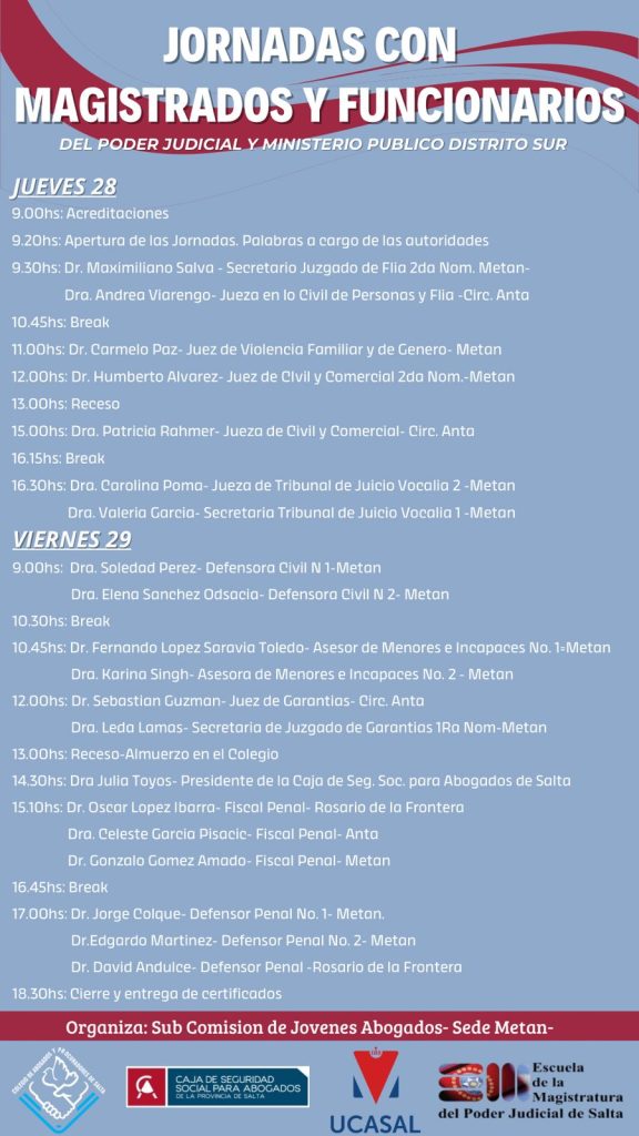 La sub comisión de jóvenes abogados de la delegación Metán invita a participar de las “Jornadas con Magistrados y Funcionarios del Poder Judicial y Ministerio Público del Distrito Sur”.