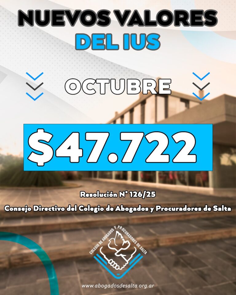 ⚖️ El CONSEJO DIRECTIVO DEL COLEGIO DE ABOGADOS DE SALTA, informa a nuestros matriculados que conforme Resolución Institucional 126/ 2.025 de fecha 03/10/2.025, el valor del IUS es del mes de Octubre es de $ 47.722.