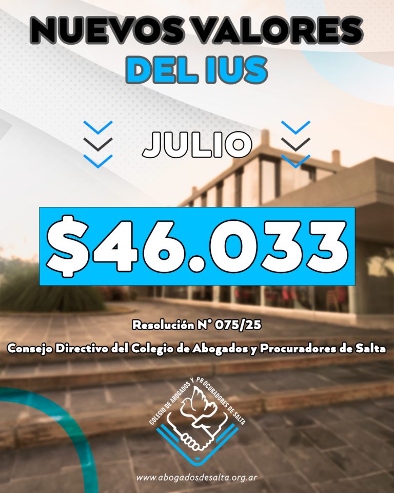 ⚖️ El CONSEJO DIRECTIVO DEL COLEGIO DE ABOGADOS DE SALTA, informa a nuestros matriculados que conforme Resolución Institucional 075/ 2.025 de fecha 02/07/2.025, el valor del IUS es de $ 46.033.