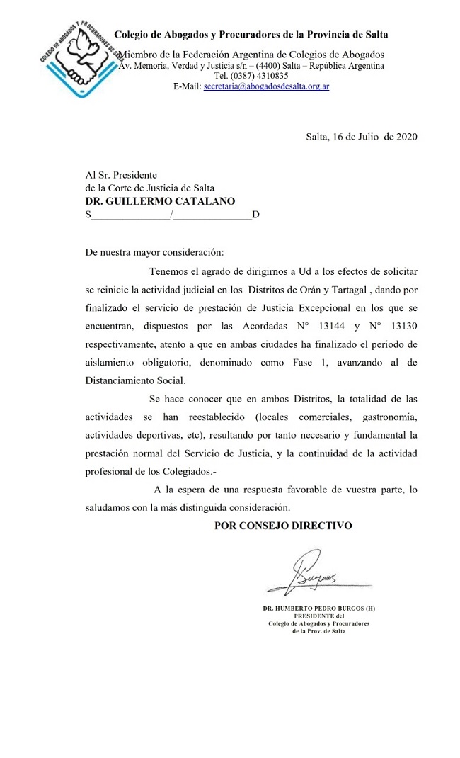 El Colegio de Abogados y Procuradores de Salta pidió a la Corte de Justicia el reinicio de la actividad judicial en los Distritos de Orán y Tartagal. Solicitando la prestación normal del Servicio de Justicia, y la continuidad de la actividad profesional de los Colegiados.