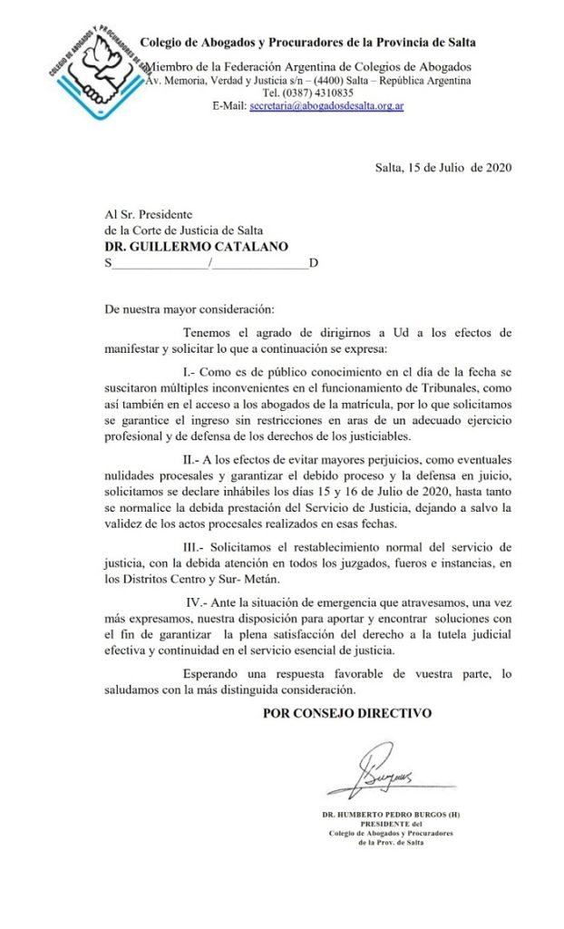 El Colegio de Abogados y Procuradores de Salta solicitó a la Corte de Justicia que garantice el ingreso sin restricciones a tribunales y el restablecimiento íntegro del servicio de justicia, con la debida atención en todos los juzgados, fueros e instancias.
