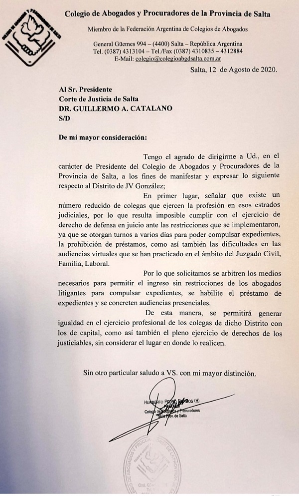 Los colegas de Joaquín V. Gonzáles manifestaron al Colegio diversas situaciones que impiden el ejervicio profesional y de derechos de los justiciables, como las restricciones en el acceso a tribunales para compulsa de expedientes, prohibición de préstamos y dificultades en audiencias virtuales. El delegado del Colegio de J. V. Gonzáles, Dr. Jorge Sanchez Ponce transmitió estas situaciones existentes, por lo que se planteo estas dificultades en un pedido a la Corte de Justicia de Salta para que arbitren los medios para la mejora del ejercicio profesional.