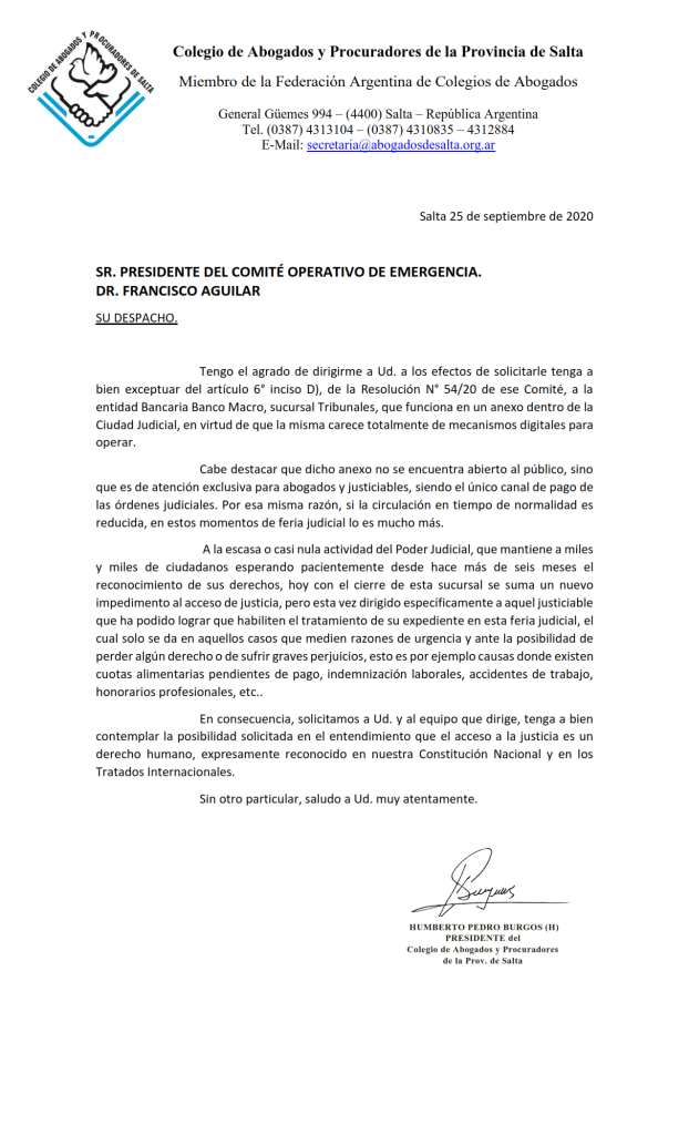 El Colegio de Abogados solicito al Sr. Presidente del COE, Dr. Aguilar, exceptuar del artículo 6° inciso D), de la Resolución N° 54/20 de ese Comité, a la entidad Bancaria Banco Macro, sucursal Tribunales, que funciona en un anexo dentro de la Ciudad Judicial, en virtud de que la misma carece totalmente de mecanismos digitales para operar. Y siendo éste el único canal de pago de las órdenes judiciales.