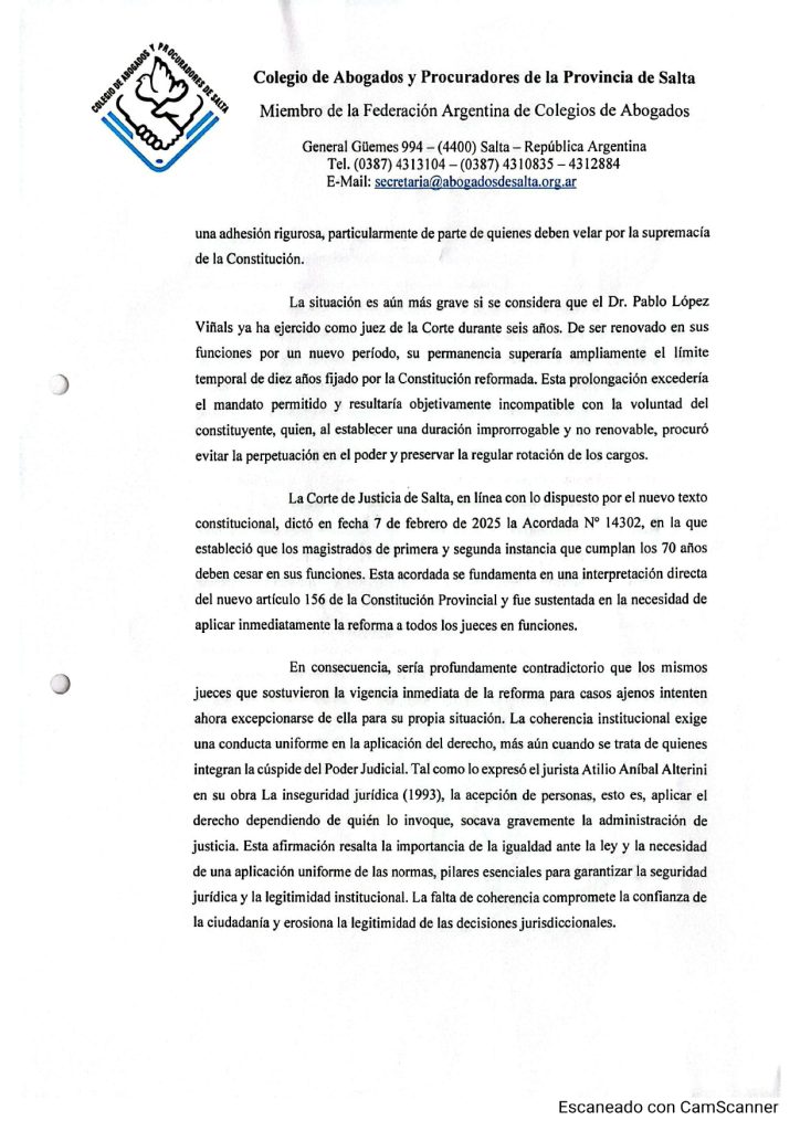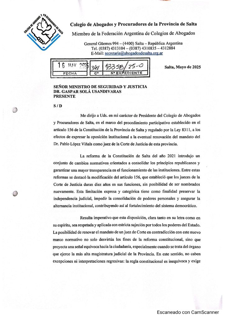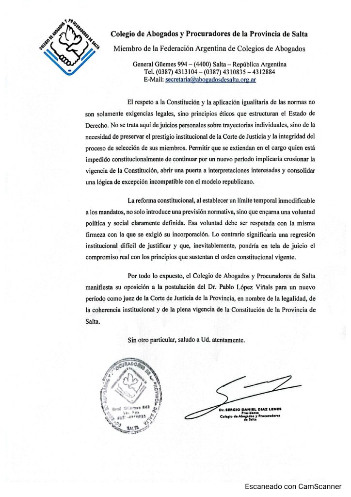 OPINIÓN INSTITUCIONAL RESPECTO A LA POSTULACIÓN DEL DR. PABLO LOPEZ VIÑALS AL CARGO DE JUEZ DE CORTE DE JUSTICIA DE SALTA